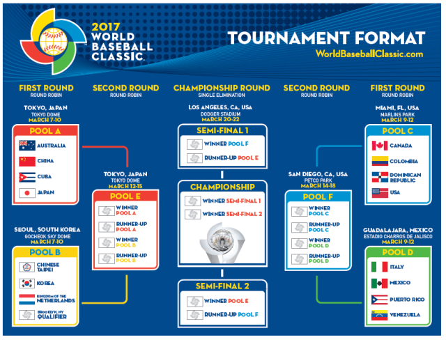 The World Baseball Classic is played every four years in the spring, before the beginning of the regular season of Major League Baseball. It is a tribute to the growth of the game throughout the world. This year (2017) there are 16 teams that represent these countries: South Korea, China Taipei, the Netherlands, Israel, Japan, Australia, China, Cuba, the United States, Canada, Colombia, the Dominican Republic, Mexico, Italy, Puerto Rico, and Venezuela.