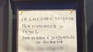 Normalmente, a Pasqua, gli italiani si riversano a Venezia e dintorni. Ma sembra che questa Pasqua né i visitatori né gli abitanti delle isole non avessero la Resurrezione in mente. Così Don Mario ha attaccato un cartello sul portone della sua chiesa con scritto “La messa è sospesa per mancanza di fedeli”. Ha aggiunto “Don Mario è disponibile su richiesta” insieme al suo numero di telefono.