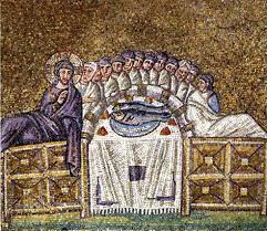 - The first artistic representation, from the 6th century A.C., is a mosaic in the Church of Sant’Apollinare Nuovo in Ravenna. There isn’t a trace of wine on the table, but besides bread, appear two large fish. From early Christian tradition, the fish was a symbol of Christ.