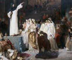 Savonarola hinted at performing miracles to prove his divine mission.  A rival Franciscan preacher proposed to test that mission by walking through fire.  The first trial by fire in Florence in over 400 years was set for April, 1498.  A crowd filled the central square eager to see if God would intervene.  Delays in the contest and then a rainstorm forced the cancellation of the proceedings.  The angry crowd blamed Savonarola for the fiasco.