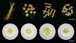 Nell’industria alimentare odierna, la pasta viene prodotta attraverso una trafila di metallo che la modella nella forma desiderata: gomito, torsione o tubo. Il team di ricercatori di questo progetto ha iniziato con una ricetta convenzionale di farina di semola e acqua, poi ha utilizzato un rullo classico per creare foglie di pasta. Ha quindi inciso sulle sfoglie minuscoli in superficie. Le superfici scanalate si dilatano meno di quelle lisce durante la cottura, creando così forme diverse. Tuttavia, il processo è più complesso del semplice rigonfiamento: la modellazione al computer ha previsto il risultato finale in base anche ad altri fattori, tra cui il modo con cui il calore e l’acqua modificano il glutine e l’amido dell’impasto durante il processo di cottura.