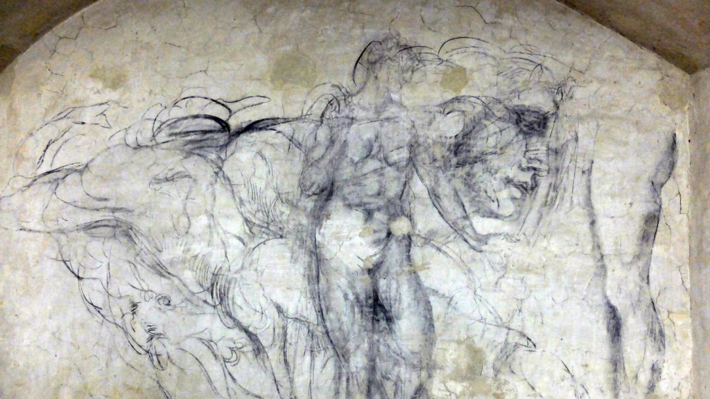 What emerged were dozens of charcoal and chalk drawings believed to be the work of Michelangelo in the room where he may have hidden during the revolt.  Some sketches are similar to his most famous works, including the statue of David, paintings in the Sistine Chapel, and a statue adorning a Medici tomb in the Sacristy above.  He apparently filled his solitude with reflections on old works, as well as sketches of those he wanted to do once he survived those dramatic months.