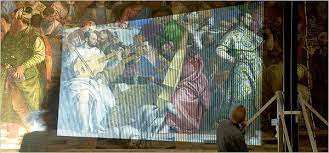 Dipinto in situ, Le Nozze di Cana è un’opera monumentale che misura 6,77 metri per 9,94 metri. È pensato per essere visto dal basso, perché il bordo inferiore del dipinto era a 2,50 metri dal pavimento del refettorio, dietro e sopra il capotavola dell’abate del monastero. Il dipinto riempì l’enorme muro fino a quando Napoleone trasformò il monastero nella sua sede veneziana nel 1797. Voleva che il dipinto fosse trasferito a Parigi. Il capo restauratore di Venezia avvertì che il dipinto era troppo grande e troppo fragile per essere spostato. Pesava 1,5 tonnellate. Ma non riuscirono a dissuadere gli uomini di Napoleone. L’opera d’arte fu sfacciatamente rimossa, avvolta in dipinti di Tintoretto, Tiziano e Veronese e fu spedita.